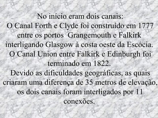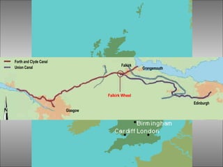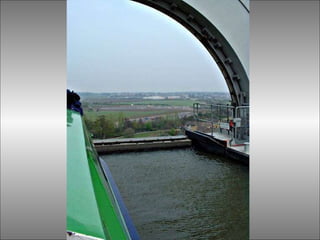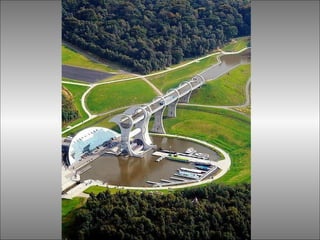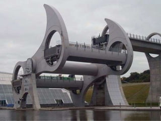 O documento descreve o Falkirk Wheel, um sistema rotativo único no mundo que conecta dois canais na Escócia e economiza tempo e energia ao transportar barcos entre eles, levando apenas 15 minutos para girar 180 graus e transferir embarcações entre os canais a uma diferença de altitude de 35 metros.