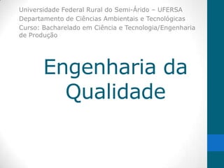 Este documento apresenta uma aula sobre engenharia da qualidade ministrada no curso de bacharelado em ciência e tecnologia/engenharia de produção da Universidade Federal Rural do Semi-Árido. A aula aborda conceitos como gestão da qualidade, normalização, auditoria e certificação, organização metrológica da qualidade e confiabilidade de processos e produtos.