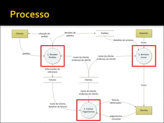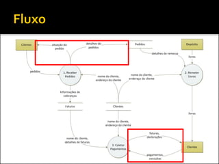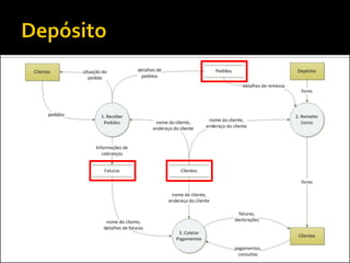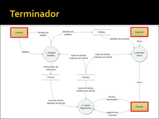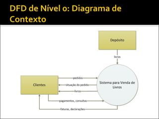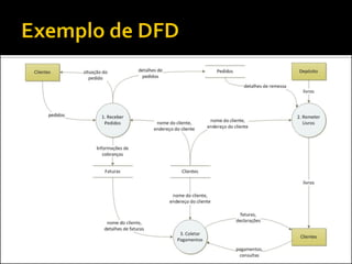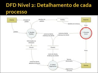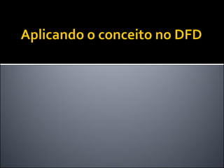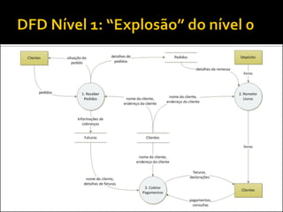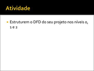 O documento discute a ferramenta de modelagem gráfica DFD (Diagrama de Fluxo de Dados) para descrever sistemas. Ele explica como estruturar DFDs em diferentes níveis de detalhamento para manter a documentação enxuta e garantir a compreensão gradual do sistema, evitando diagramas complexos. Também incentiva os alunos a estruturarem o DFD do seu projeto nos níveis 0, 1 e 2.