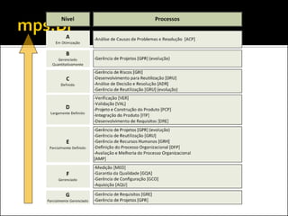 O documento discute processos de engenharia de software e o modelo CMMI. Apresenta o CMMI como uma compilação de boas práticas no processo de desenvolvimento de software e explica que ele abrange todo o ciclo de vida de desenvolvimento, operação e aquisição de software. Também discute o modelo brasileiro MPS.BR e ressalta que o sucesso de um processo depende principalmente da motivação e do alinhamento com a estratégia da empresa.
