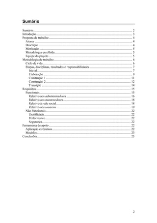 Este documento apresenta a proposta de desenvolvimento de um sistema web chamado Marquivos.com para gerenciamento e compartilhamento de arquivos. O projeto será desenvolvido utilizando a metodologia RUP e terá as seguintes etapas: inicial com foco em requisitos e prototipagem, elaboração com desenvolvimento da arquitetura e implementação parcial, e construção com conclusão da implementação e testes.