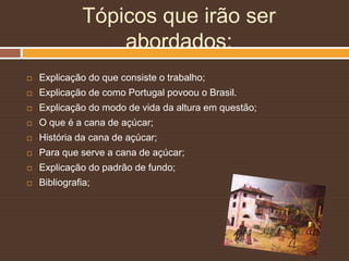 Este documento descreve a vida e o trabalho em um engenho de cana-de-açúcar no Brasil do século XVII. Explica como Portugal povoou o Brasil trazendo colonos e escravos, e como os escravos trabalhavam intensamente nos engenhos sob os patrões portugueses. Também fornece detalhes sobre a cana-de-açúcar, sua história e uso para adoçar.