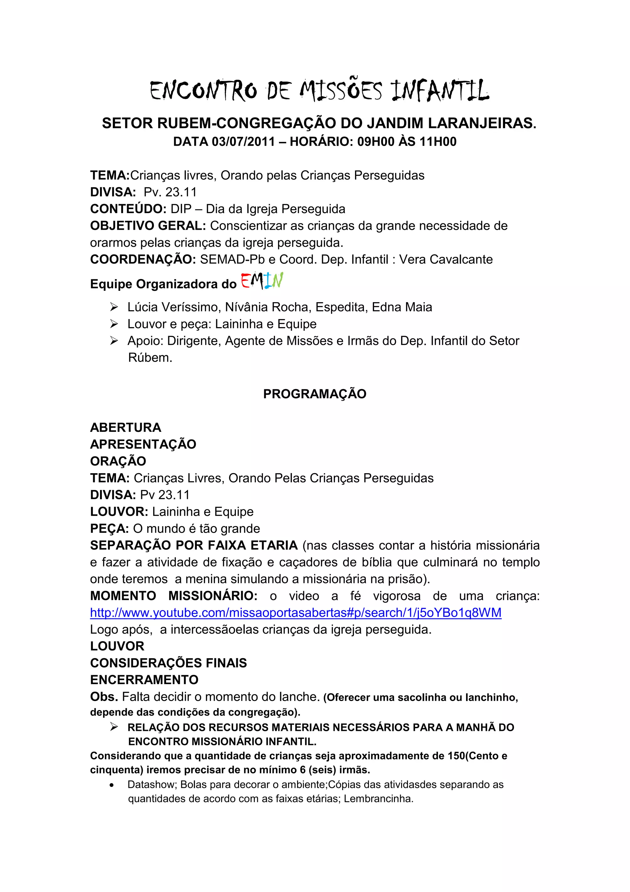 O documento descreve um encontro de missões infantil que ocorrerá no dia 03/07/2011 na Congregação do Jardim Laranjeiras. O tema será "Crianças livres, Orando pelas Crianças Perseguidas" e o objetivo é conscientizar as crianças sobre a necessidade de orar pelas crianças da igreja perseguida. A programação inclui louvor, peça teatral, momentos de oração e reflexão sobre a igreja perseguida.