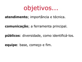 O documento discute estratégias para equipes de serviço e atendimento, enfatizando a importância da comunicação, da diversidade de públicos e do trabalho em equipe. É dividido em seções sobre objetivos, atividades, conceitos de atendimento e tipos de serviços.