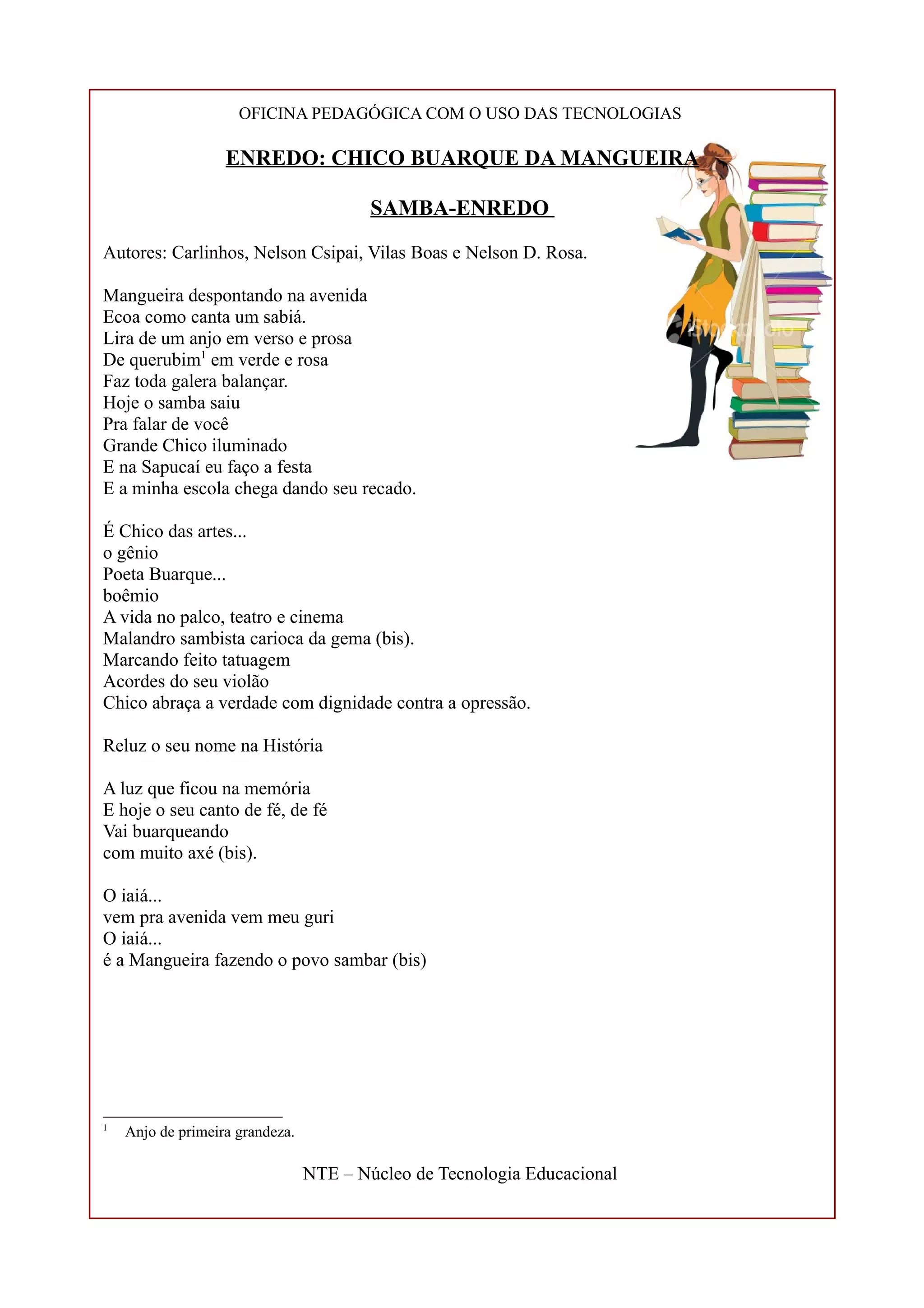 O documento apresenta o samba-enredo da escola de samba Mangueira para o carnaval, homenageando o cantor e compositor Chico Buarque. O samba destaca a vida e obra de Chico Buarque, seu talento como poeta, músico e ator, e como usa sua arte para falar sobre questões políticas e sociais de forma digna e contra a opressão.