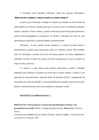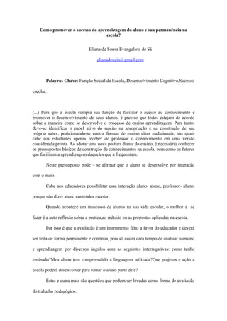 O documento discute como promover o sucesso da aprendizagem dos alunos e sua permanência na escola. Sugere que os educadores devem possibilitar a interação entre alunos, professores e conteúdos, e avaliar continuamente o ensino para compreender como os alunos aprendem. Também defende que a escola deve se adaptar à evolução da sociedade e à cultura dos alunos para tornar o ambiente escolar acolhedor e proporcionar aprendizagens significativas.