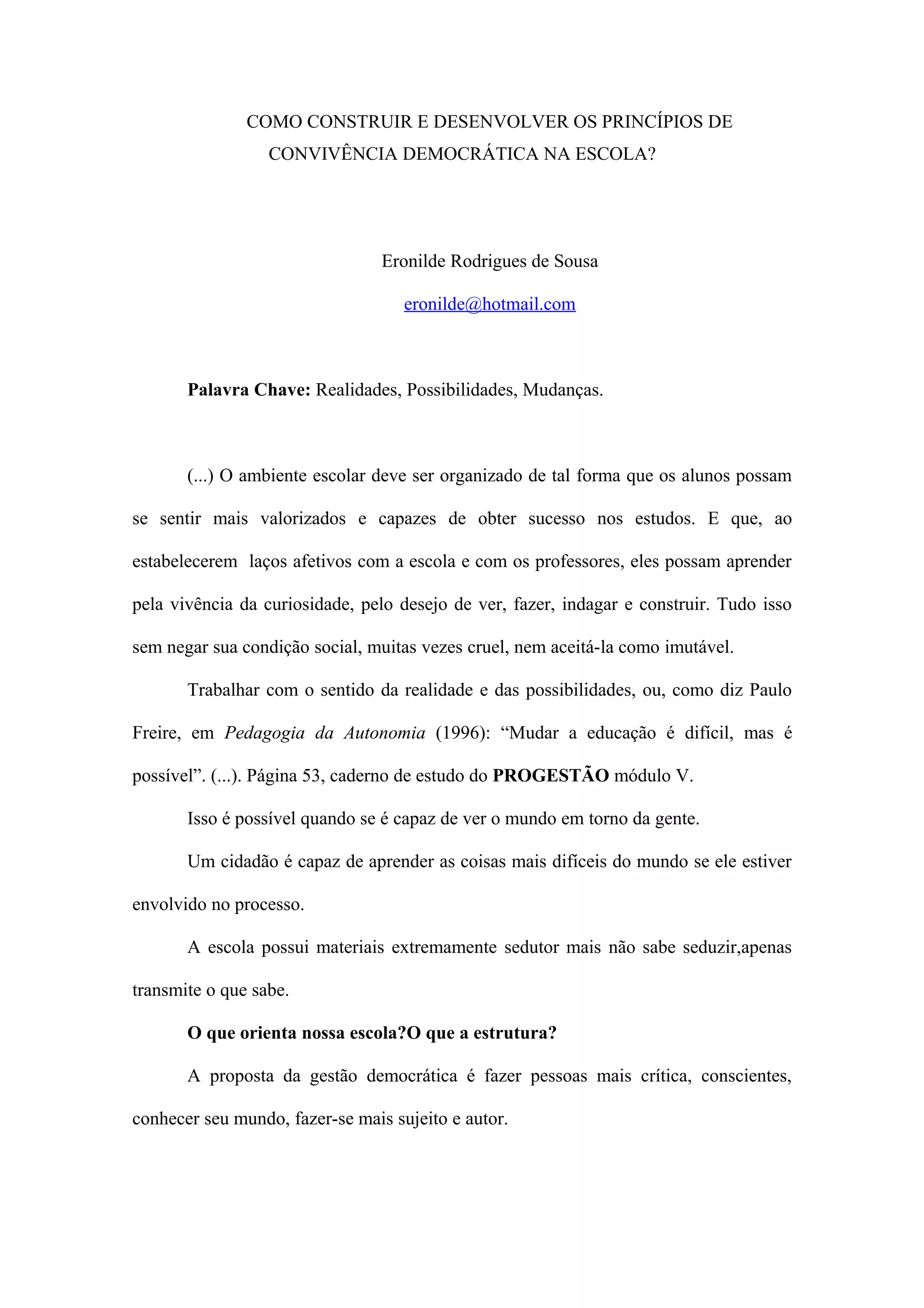 O documento discute como construir e desenvolver princípios democráticos na escola. Ele argumenta que as escolas devem valorizar os alunos e estabelecer laços afetivos para que os alunos aprendam por curiosidade. Também defende que a educação deve formar os alunos para serem críticos e conscientes do mundo, capazes de mudar a realidade. Finalmente, diz que as crianças sofrem quando suas ideias não são levadas a sério e que a autonomia permite mais criatividade.