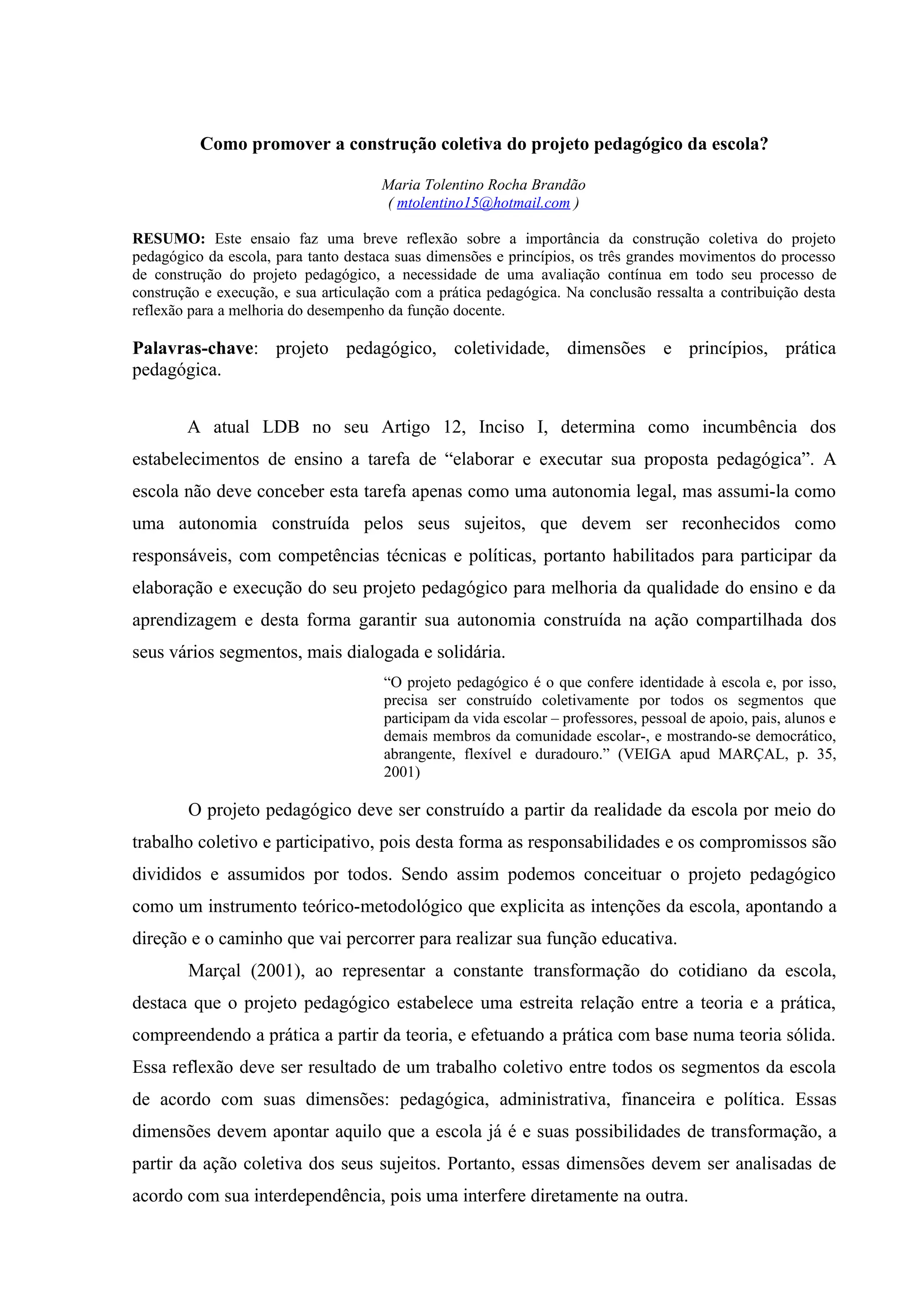 Este documento discute a importância da construção coletiva do projeto pedagógico da escola, envolvendo todos os segmentos da comunidade escolar. Ele destaca três movimentos chave no processo de construção do projeto: diagnóstico da realidade da escola, levantamento das concepções do grupo, e definição de estratégias e responsabilidades. O documento argumenta que o projeto pedagógico deve ser um processo contínuo e participativo.