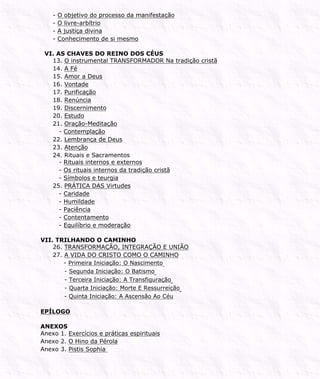 O documento apresenta uma introdução aos ensinamentos esotéricos de Jesus e à tradição cristã esotérica. Afirma que os ensinamentos centrais de Jesus foram negligenciados ao longo dos séculos, mas que é possível recuperá-los para buscar o Reino dos Céus aqui e agora, ao invés de esperar por um paraíso distante. Argumenta que os ensinamentos esotéricos capacitam o homem a alcançar seu potencial divino e a herança de Deus, tornando-se um Cristo.