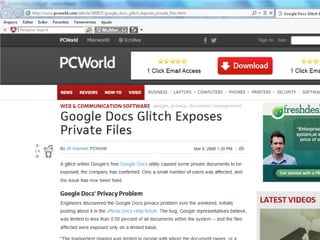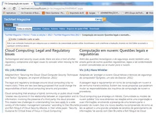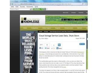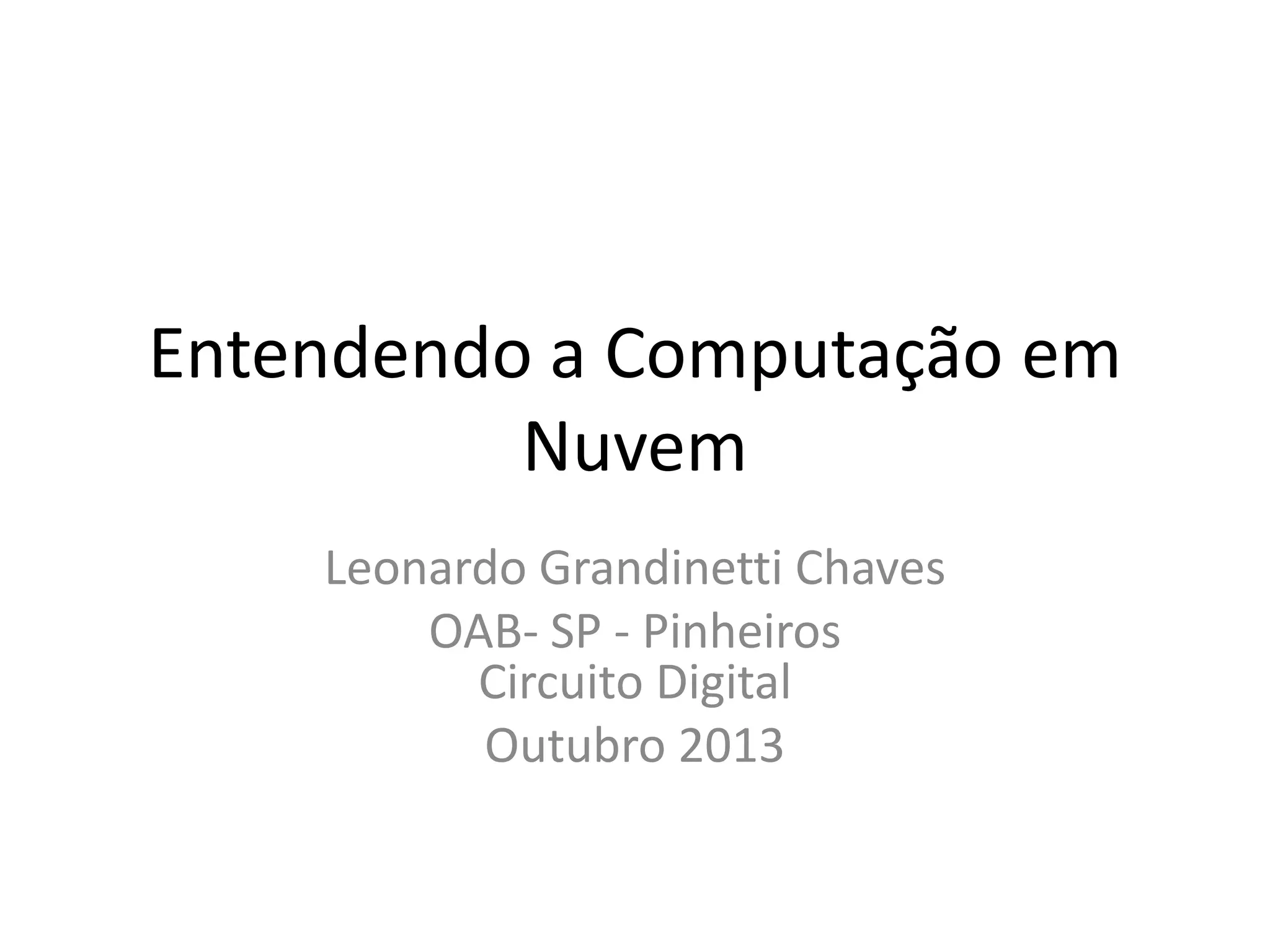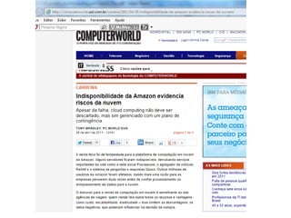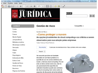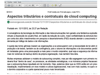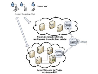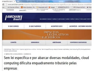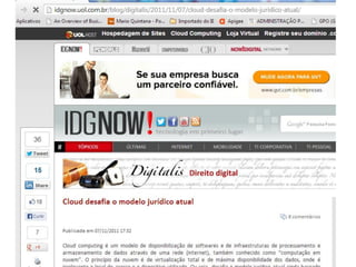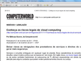 O documento discute os conceitos e implicações da computação em nuvem, resumindo: (1) a definição de computação em nuvem segundo o NIST; (2) os principais modelos de serviço (IaaS, PaaS, SaaS); (3) os riscos envolvidos, como segurança e questões jurídicas e tributárias que devem ser tratados em contratos.