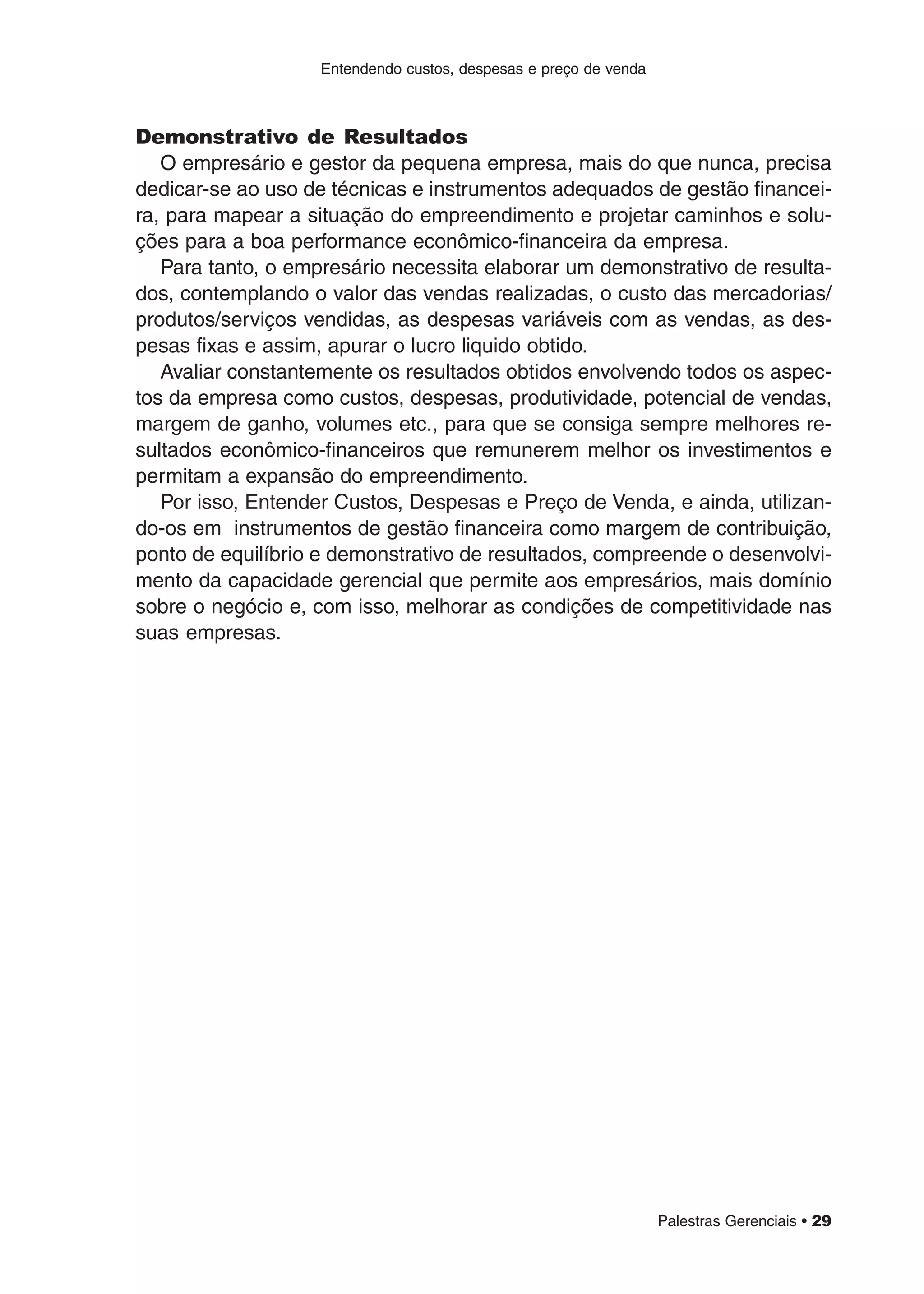 O documento discute a importância de entender custos, despesas e preço de venda para melhorar o desempenho financeiro de pequenas empresas. Explica que é necessário elaborar demonstrativos de resultados considerando vendas, custos, despesas fixas e variáveis para calcular lucros. Também aborda conceitos como margem de contribuição, ponto de equilíbrio e rentabilidade, e como eles podem ser usados na gestão financeira.