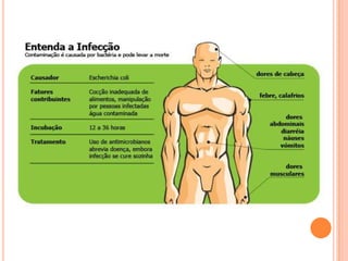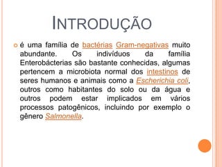 O documento discute Enterobactérias como E. coli e Salmonella, incluindo suas características, formas de contaminação e transmissão, sintomas e tratamento. E. coli geralmente faz parte da microbiota intestinal humana, enquanto Salmonella pode causar intoxicação alimentar através de alimentos contaminados. Os principais sintomas incluem diarreia e cólicas abdominais, e a prevenção envolve boa higiene e cuidados com alimentos.