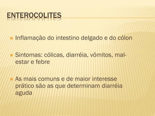 O documento discute enterocolites, inflamações do intestino delgado e cólon, causadas principalmente por vírus, parasitas e bactérias. As enterocolites agudas mais comuns incluem aquelas causadas por rotavírus, giardia e bactérias como E. coli e campylobacter, resultando em sintomas como diarreia, cólicas e febre. O diagnóstico e tratamento envolvem reidratação, dieta e em alguns casos antibióticos.
