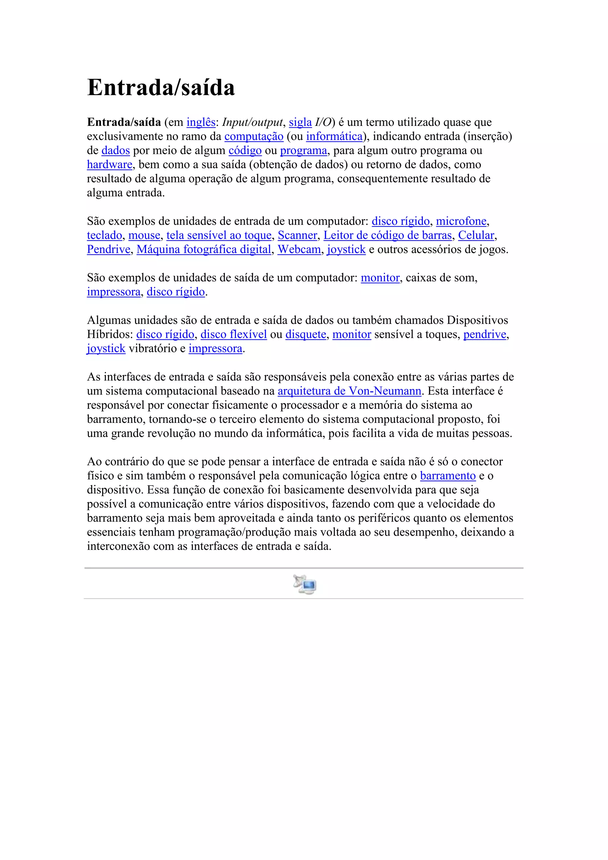 Entrada/saída refere-se à entrada e saída de dados em computação. Exemplos de entrada incluem teclados, mouses e scanners, enquanto exemplos de saída incluem monitores e impressoras. Algumas unidades como discos rígidos permitem tanto entrada quanto saída de dados. As interfaces de entrada e saída conectam dispositivos ao barramento do computador para comunicação.