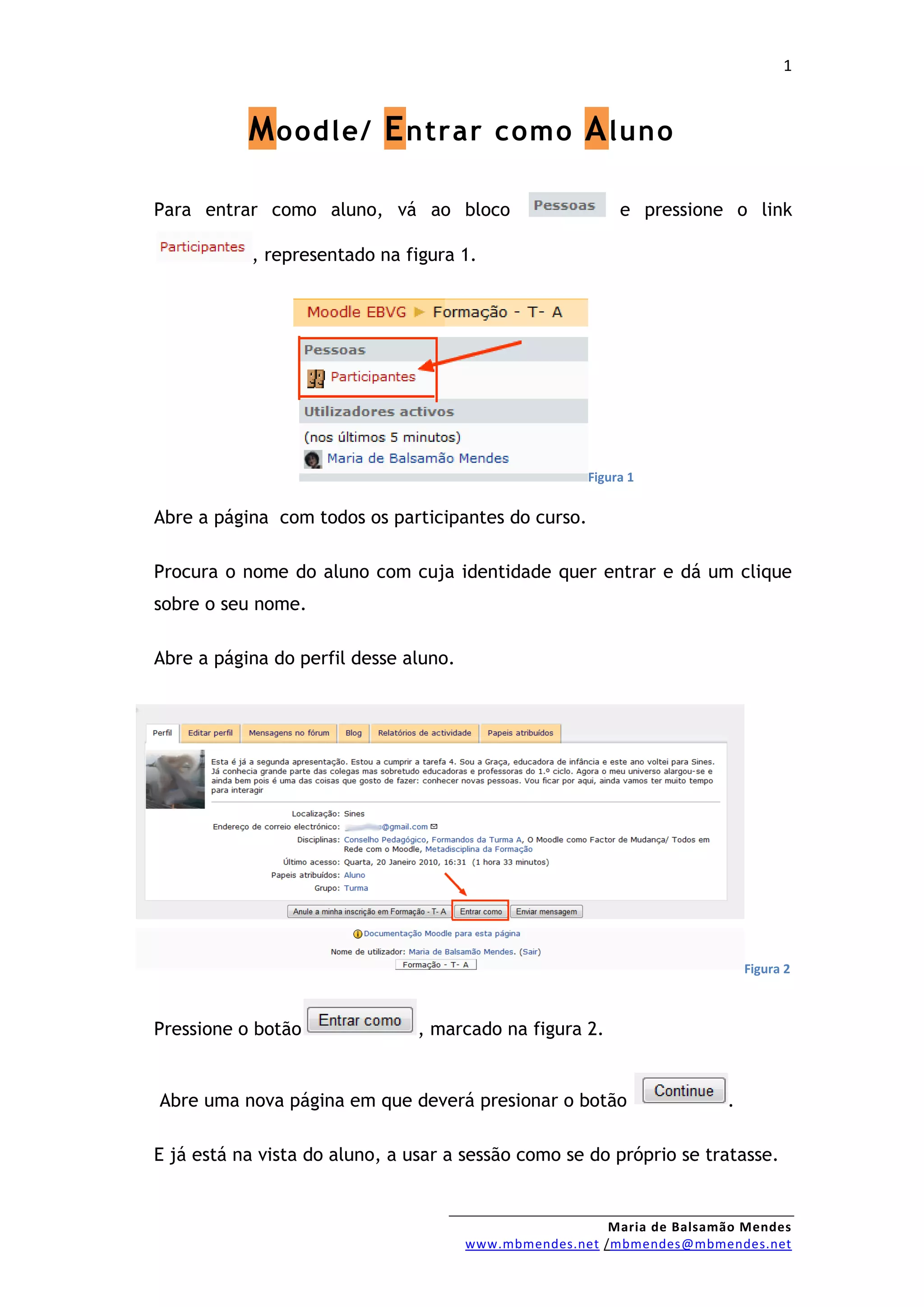 Entrar como aluno no Moodle requer 3 etapas: 1) clicar no link "Entrar como aluno" na página inicial, 2) selecionar o nome do aluno e clicar no perfil, 3) clicar nos botões "Entrar como" e "Confirmar" para assumir a sessão do aluno selecionado.