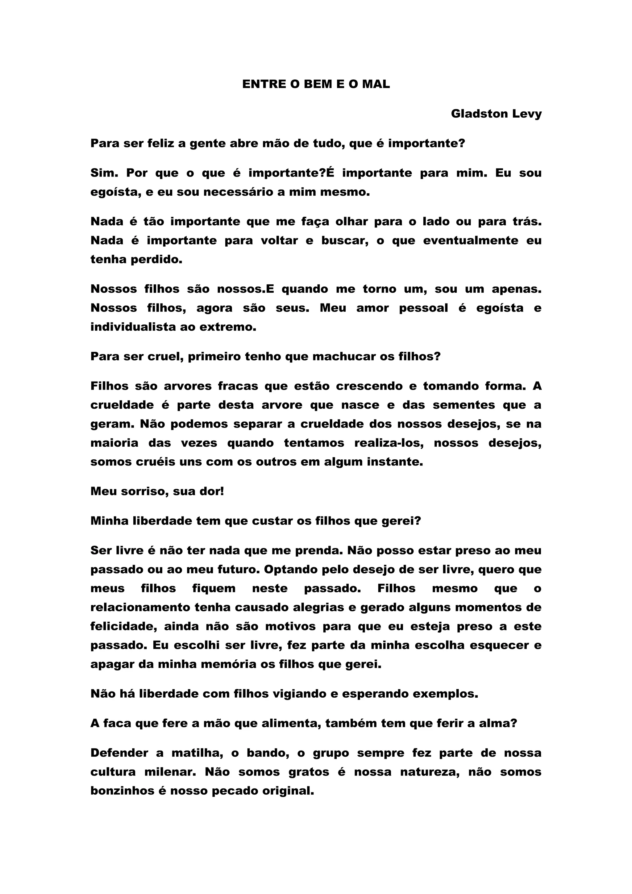 O documento discute a natureza do bem e do mal na sociedade humana. O autor argumenta que (1) o egoísmo e a liberdade individual são valores supremos e que (2) os filhos não devem limitar a liberdade de um indivíduo, e (3) que a crueldade e o mal fazem parte da natureza humana e da formação de nossa alma.