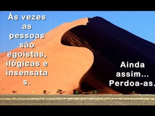 O documento discute como as pessoas podem reagir de forma egoísta, ilógica e insensível, mas enfatiza a importância de perdoar, ser amável, honesto e feliz, construir o bem, e dar o melhor de si mesmo, independentemente da reação dos outros. A mensagem final é que no fim das contas, a única relação que importa é entre a pessoa e Deus.