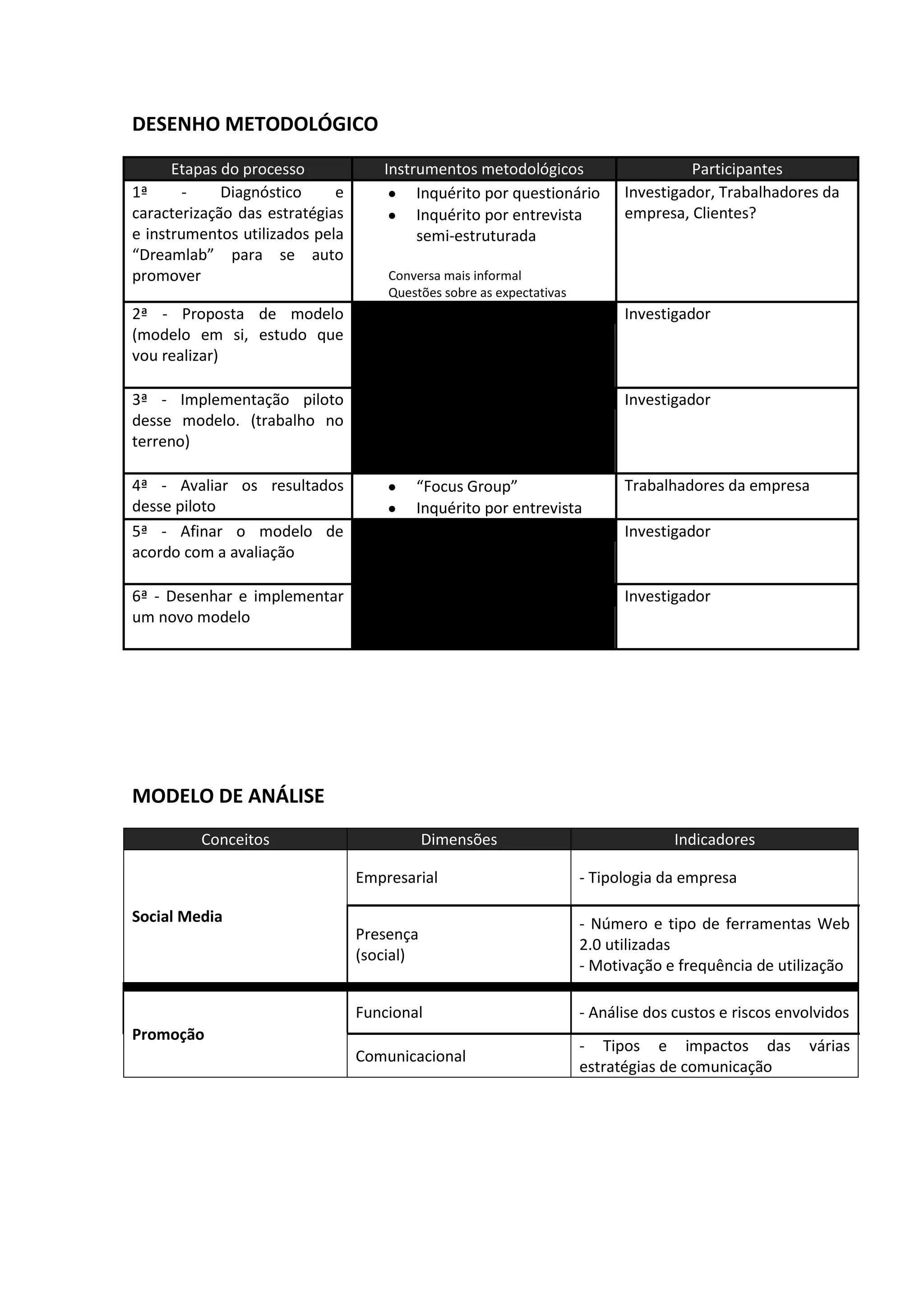 O documento descreve um desenho metodológico que inclui etapas de diagnóstico, proposta de modelo, implementação piloto, avaliação de resultados e refinamento do modelo, focando nas estratégias utilizadas pela “dreamlab” para auto promoção. Métodos como questionários e entrevistas são utilizados para coletar dados de participantes, incluindo trabalhadores e clientes. A análise envolve a tipologia da empresa, presença em mídias sociais e a eficácia das estratégias de comunicação.