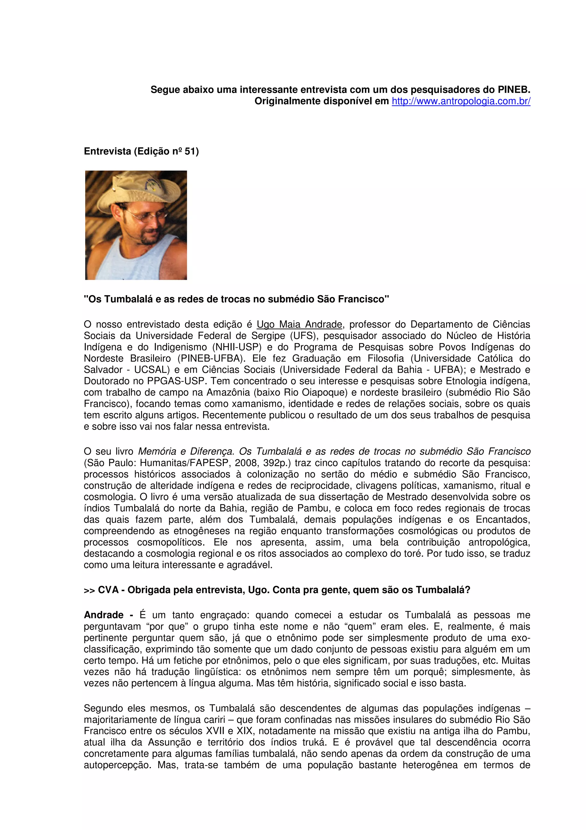 O documento apresenta uma entrevista com Ugo Maia Andrade, pesquisador do PINEB, sobre os Tumbalalá, povo indígena do submédio São Francisco. Andrade explica que os Tumbalalá são descendentes de povos indígenas confinados em missões no passado, embora tenham origens heterogêneas. Atualmente somam cerca de 1.100 pessoas distribuídas em terras nos municípios de Curaçá e Abaré, Bahia. O processo de identificação e delimitação de seu território foi recent