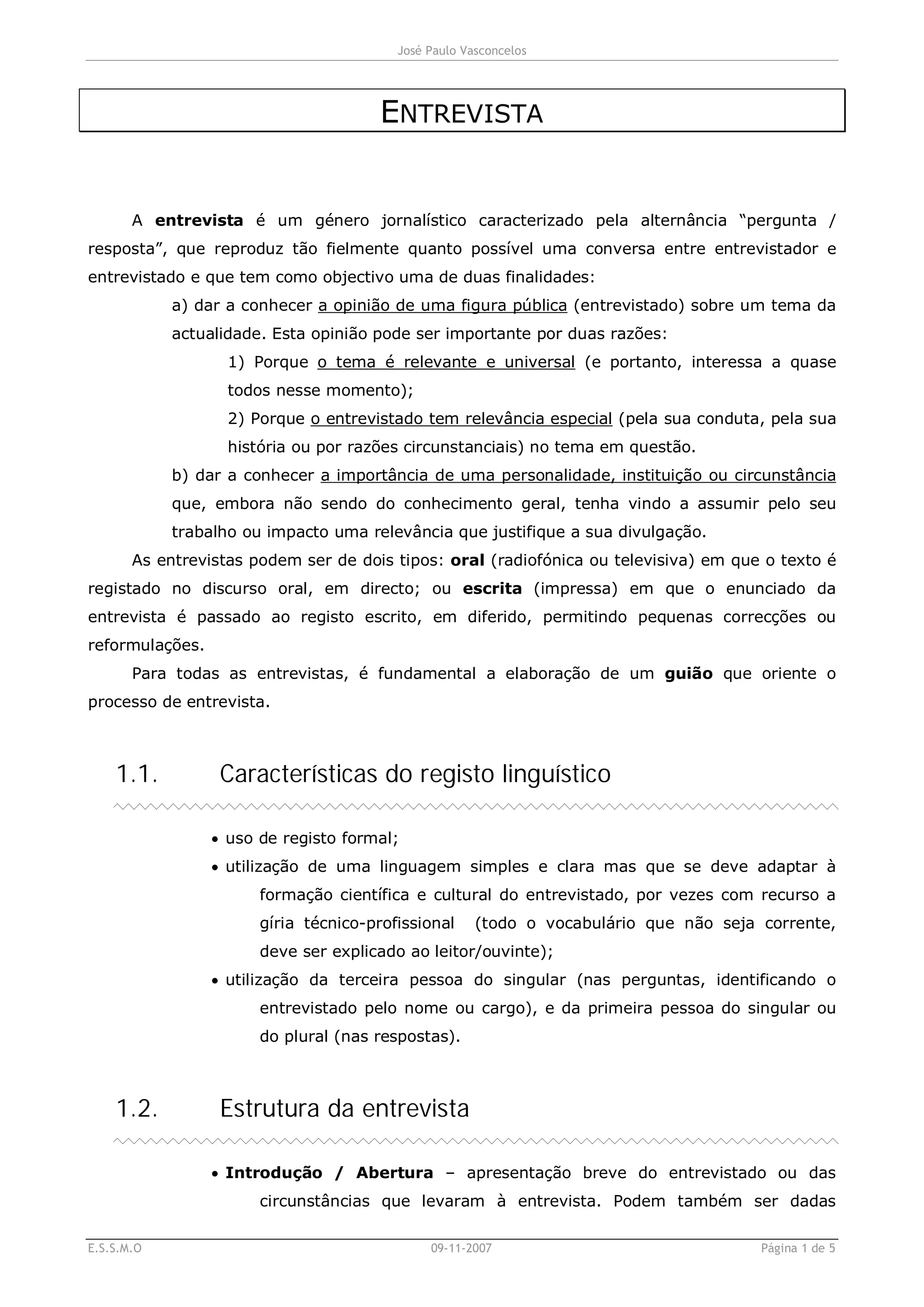 Este documento fornece um guia sobre o gênero jornalístico da entrevista, abordando suas características, estrutura, guião e registro escrito. A entrevista é caracterizada pela alternância entre perguntas e respostas e tem como objetivo dar a conhecer a opinião de uma figura pública sobre um tema ou divulgar a importância de uma personalidade. Um bom guião é fundamental para orientar o processo de entrevista.