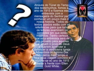 Esta entrevista com Ellen White em 1915 destaca a importância de manter os princípios doutrinários fundamentais estabelecidos por Deus para a Igreja Adventista. Ela adverte que Satanás está tentando remover esses pilares da fé para substituí-los por doutrinas falsas, o que poderia levar a Igreja a se tornar uma irmã da caída Babilônia. Ela enfatiza a necessidade de defender com firmeza a verdade revelada por Deus.