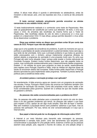 Este resumo aborda uma entrevista com Philip Davies, da Associação Europeia Contra o Cancro do Colo do Útero, sobre medidas para prevenir este tipo de câncer. Davies afirma que programas de rastreamento nacional combinados com novas tecnologias como vacinas e testes para detecção do HPV podem evitar 95% dos casos. No entanto, os custos elevados destas iniciativas têm dificultado sua implementação pelos governos, apesar de fundos europeus estarem disponíveis.
