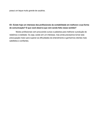 A entrevista discute a importância da comunicação para profissionais contábeis. O entrevistado afirma que a boa comunicação é essencial para o desempenho das funções e carreira do contador, considerando que eles elaboram demonstrações e relatórios que influenciam decisões de empresas. Uma comunicação sem clareza pode levar clientes a tomarem decisões prejudiciais com base em interpretações equivocadas. Atualmente, mais contadores buscam cursos para melhorar a produção de relatórios e habilidades de comunicação oral, mas