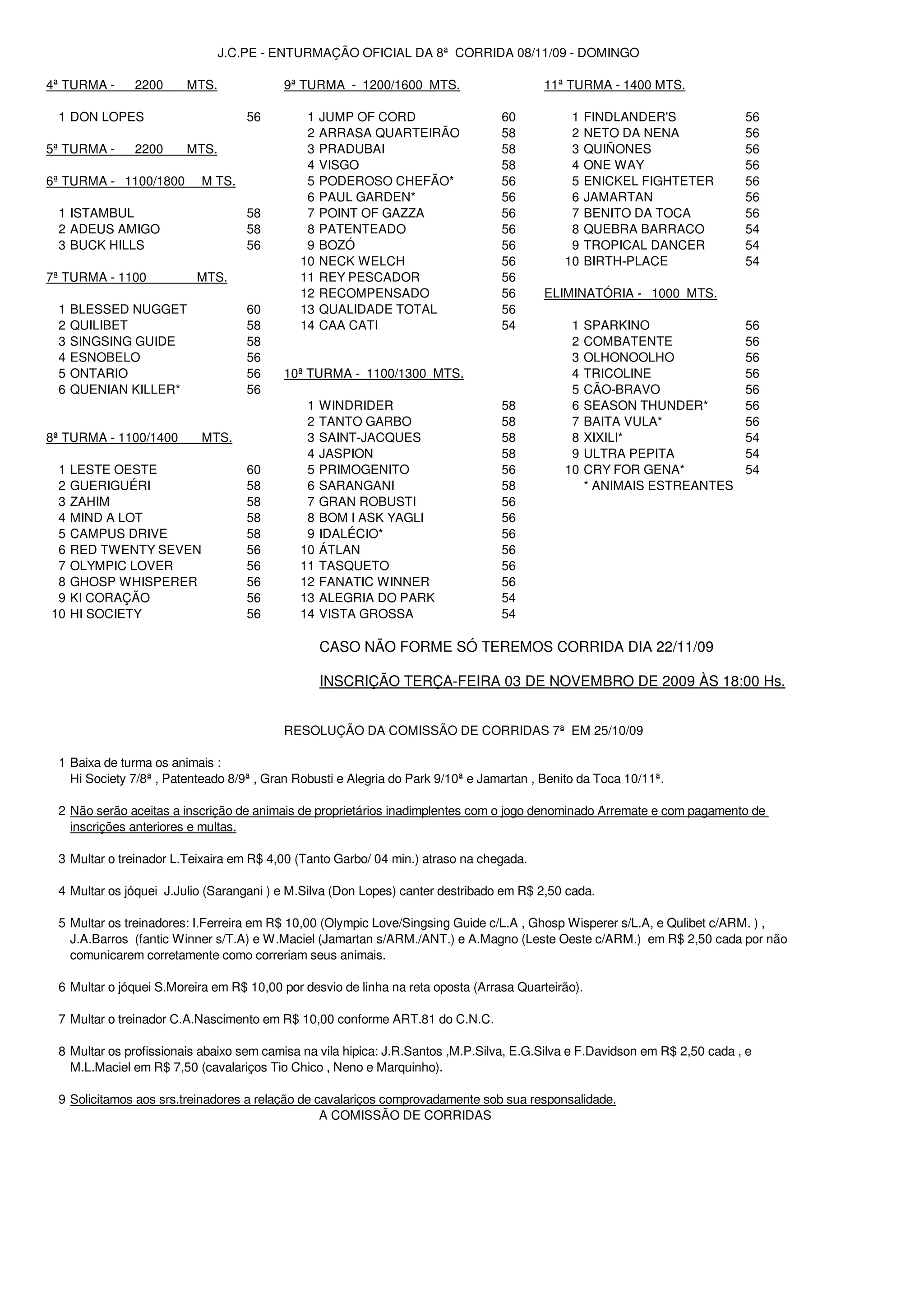 1) O documento apresenta a programação oficial da 8a corrida que ocorrerá no dia 08/11/09, com a distribuição dos cavalos pelas diferentes turmas.