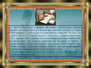 O documento conta a história de Aureliano Correia, um homem que se entusiasmou com o Espiritismo mas não estava preparado para a responsabilidade que vinha com isso. Ele prometeu muito trabalho pela doutrina mas quando surgiram dificuldades, desistiu. A reflexão final diz que é preciso ir além do entusiasmo inicial e assumir de fato o compromisso de ser um espírita, lutando contra as próprias imperfeições.