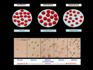 O documento descreve as principais características da parede celular e membrana plasmática de células, incluindo sua composição, estrutura e funções como proteção e permeabilidade. Também explica os processos de transporte celular, distinguindo transporte passivo como difusão e osmose de transporte ativo como as bombas de sódio e potássio que mantém gradientes iônicos.