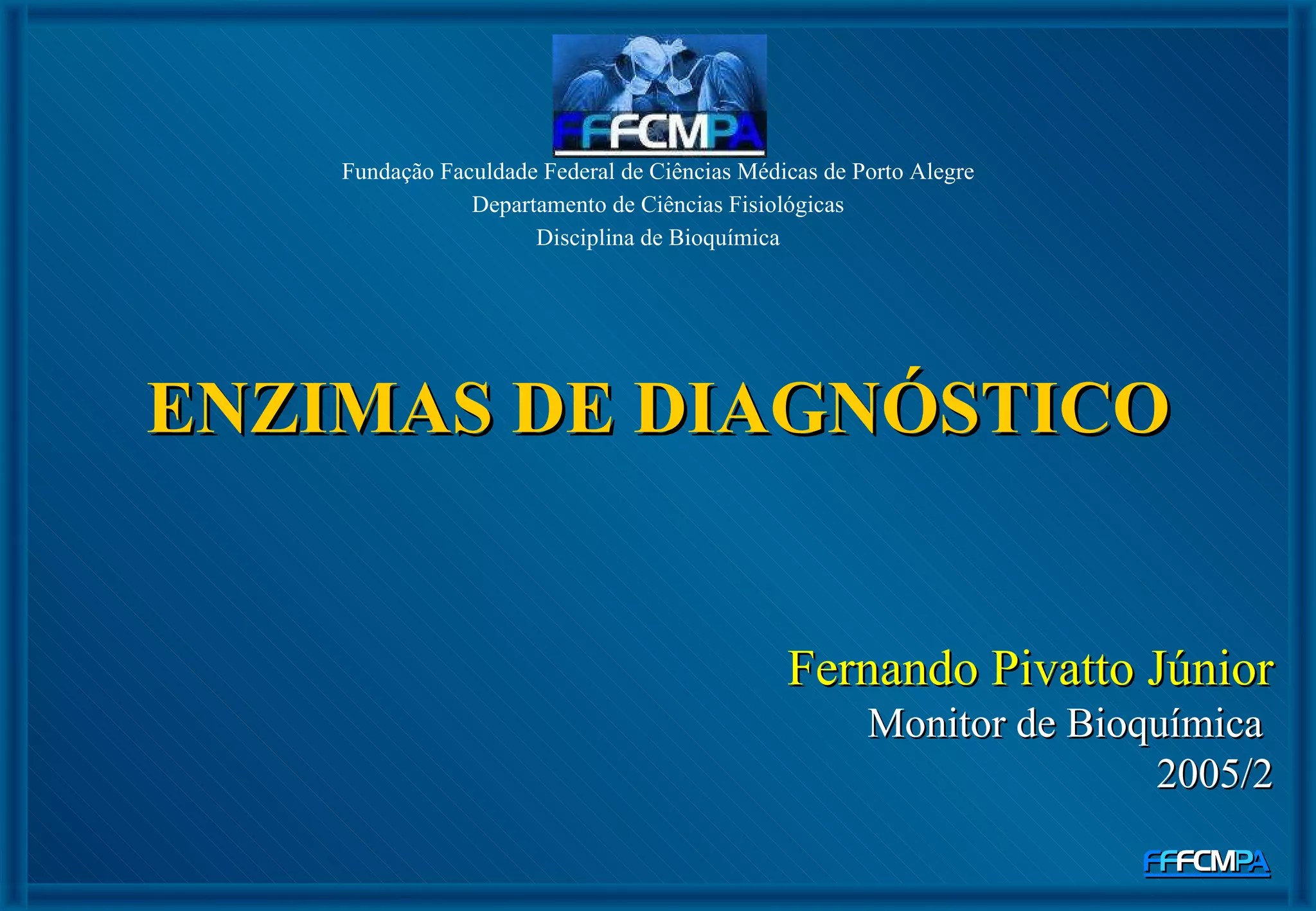 O documento descreve várias enzimas usadas no diagnóstico de doenças, incluindo suas principais concentrações teciduais e utilidade diagnóstica. As enzimas discutidas incluem fosfatase ácida, fosfatase alcalina, TGO, TGP, GGT, amilase, lipase, CK e LDH.