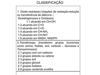 O documento classifica as enzimas em 6 categorias principais com base em sua função bioquímica e discute os cofatores, substratos e cinética enzimática. Ele também fornece detalhes sobre como a glicosiltransferase catalisa a produção de polissacarídeos como a dextrana a partir da sacarose.