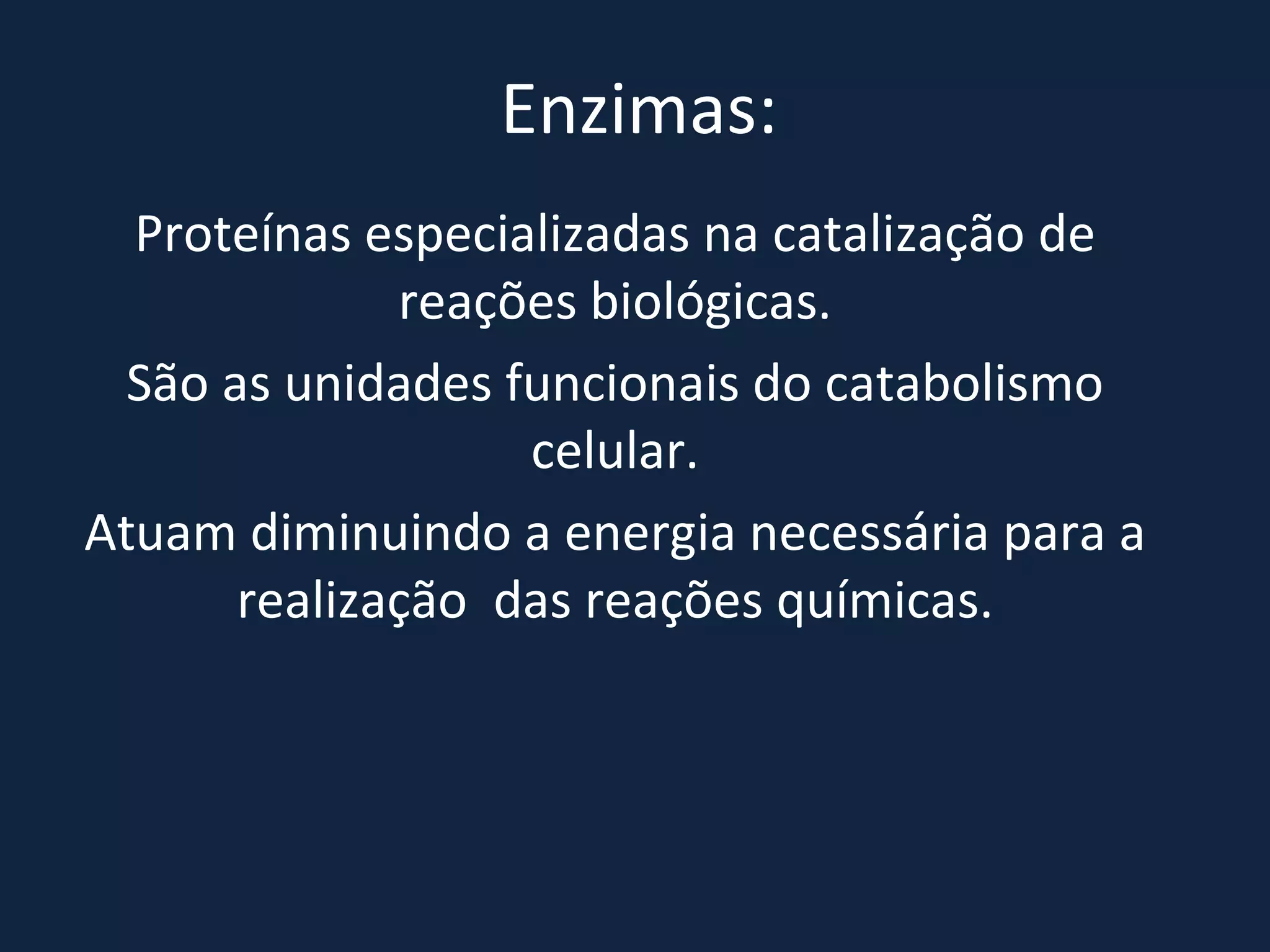 Enzimas são proteínas que catalisam reações biológicas, diminuindo a energia necessária. Elas podem ser classificadas por local de atuação ou composição química, e requerem cofatores para funcionar. Enzimas são específicas, reutilizáveis e podem atuar em direções reversíveis, com velocidade proporcional à concentração do substrato, podendo ser inibidas. A atividade enzimática depende de pH e temperatura ótimos.