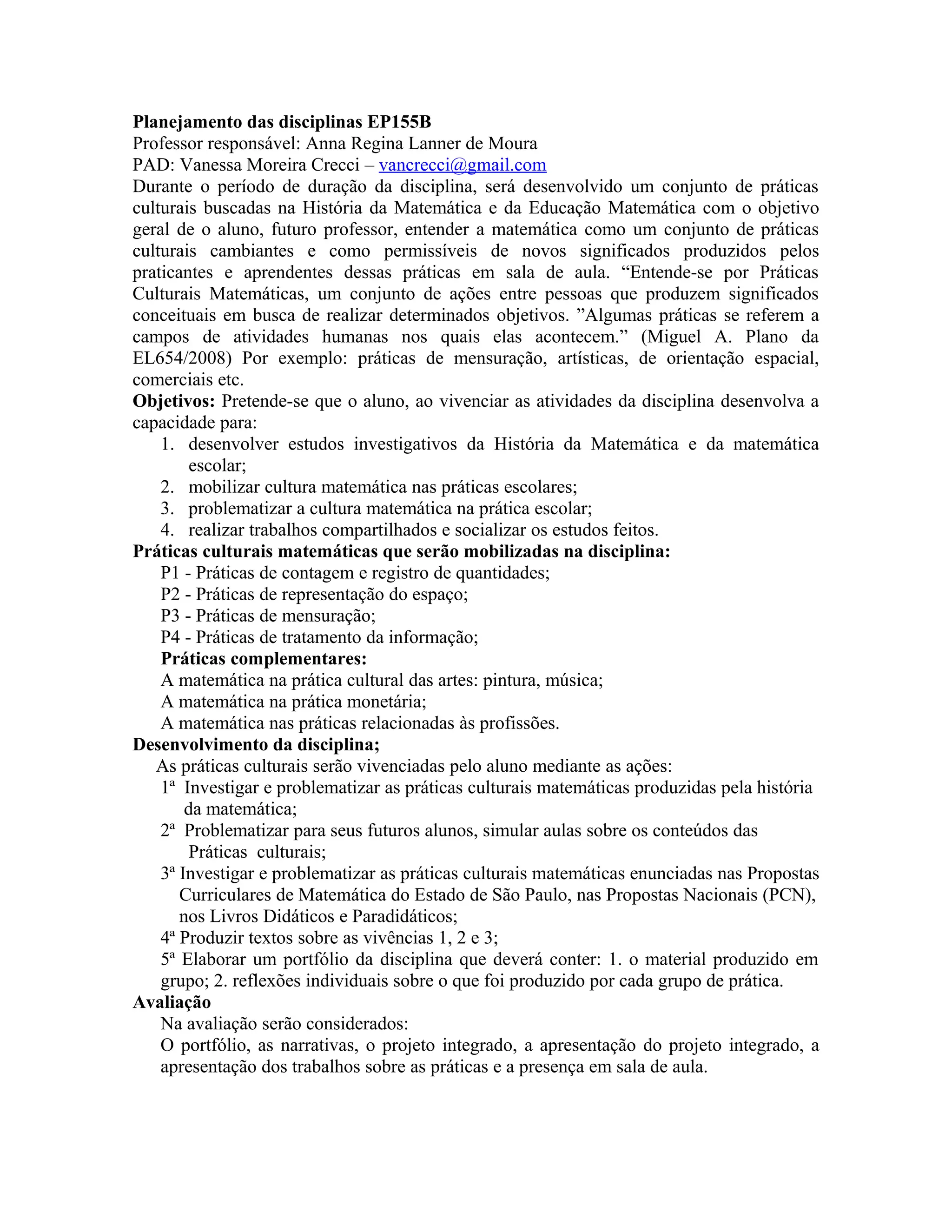 Este documento descreve o planejamento da disciplina EP155B sobre práticas culturais matemáticas, com objetivo de entender a matemática como conjunto de práticas culturais. Serão estudadas práticas históricas de contagem, representação espacial, mensuração e tratamento de informação, bem como em artes, dinheiro e profissões. Os alunos investigarão, problematizarão e simularão essas práticas.