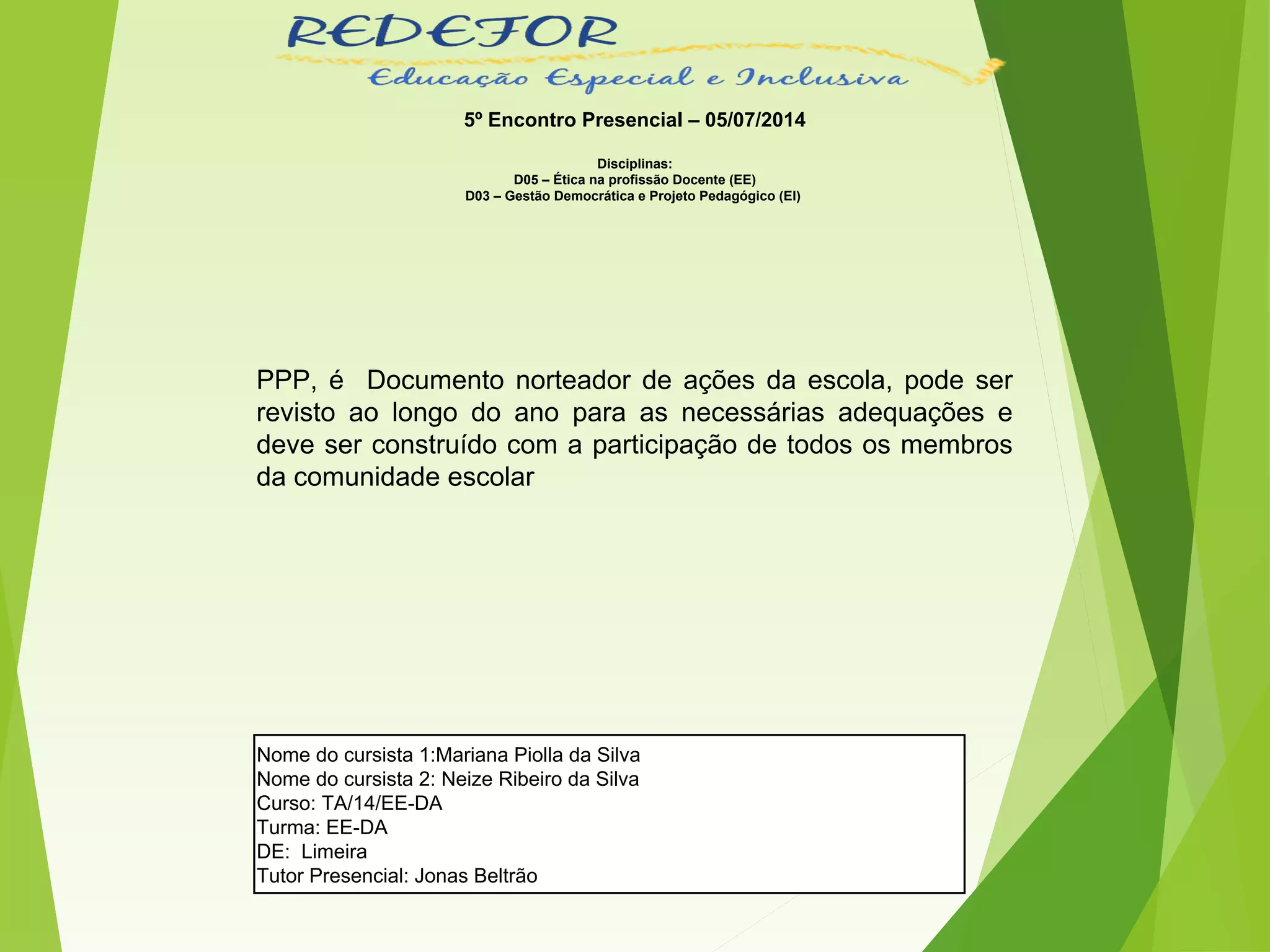 O documento discute a importância do Projeto Político Pedagógico (PPP) e da inclusão de alunos com necessidades especiais nas escolas. Ele destaca que o PPP deve ser construído com participação da comunidade escolar e pode ser revisado durante o ano. Também enfatiza estratégias como fortalecer o conselho escolar, promover a formação continuada de professores e incluir a comunidade na elaboração do PPP para melhor atender a diversidade de alunos.