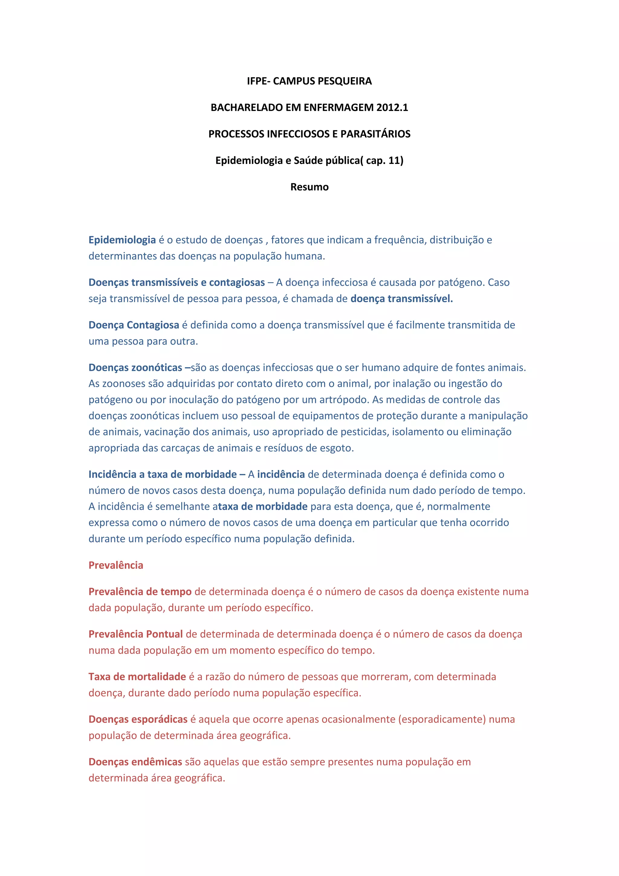 Epidemiologia é o estudo das doenças, fatores que indicam a frequência, distribuição e determinantes das doenças na população humana. O ciclo de infecção envolve seis componentes, incluindo uma fonte do patógeno, um reservatório, uma porta de saída, um modo de transmissão, uma porta de entrada e um hospedeiro susceptível. Doenças zoonóticas são transmitidas de animais para humanos.