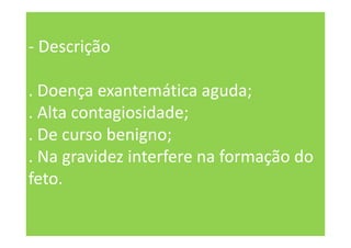 O documento descreve as doenças Rubéola e Sarampo, incluindo suas características, agentes causadores, formas de transmissão, sintomas, diagnóstico, tratamento e aspectos epidemiológicos. A Rubéola é uma doença viral aguda e contagiosa que pode ter complicações graves na gravidez, enquanto o Sarampo é uma doença viral grave e altamente contagiosa que afeta principalmente crianças. Ambas podem ser prevenidas através da vacinação.