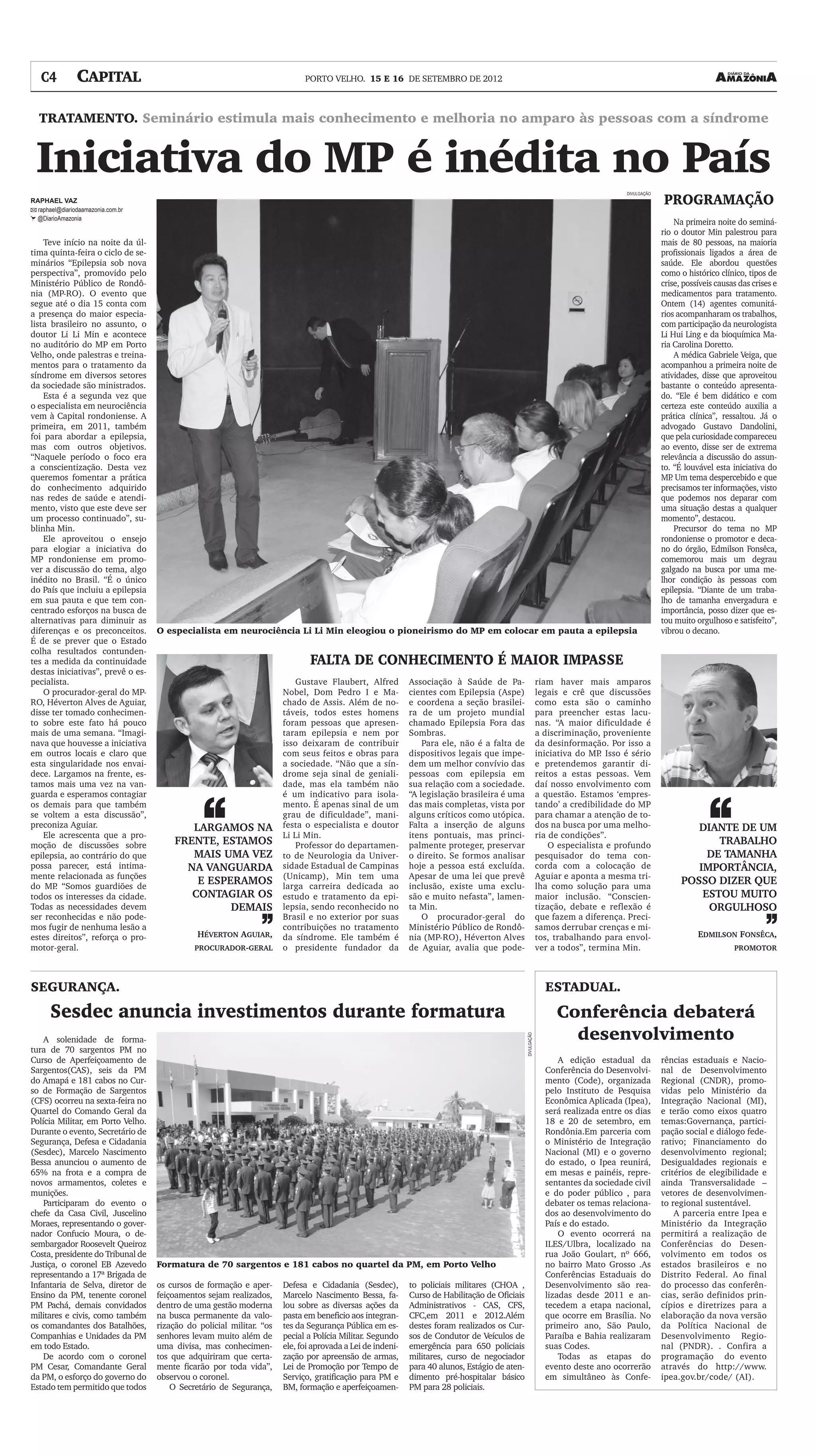 O documento descreve um seminário sobre epilepsia promovido pelo Ministério Público de Rondônia com a presença do maior especialista brasileiro no assunto. O objetivo é fomentar a prática do conhecimento adquirido sobre a síndrome nas redes de saúde e combater preconceitos. O especialista elogia a iniciativa inédita no país de discutir o tema.