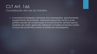 O documento discute a importância do uso de equipamentos de proteção individual (EPI) no trabalho. A Consolidação das Leis do Trabalho e as Normas Regulamentares determinam que empregadores forneçam EPI gratuitamente e que seu uso é obrigatório. Exemplos de EPI incluem capacetes, luvas, óculos e botas, que protegem contra ferimentos. Tanto empregados quanto empregadores têm deveres em relação ao uso e fornecimento correto de EPI.