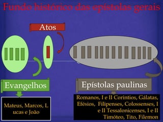 O documento apresenta um resumo sobre Estudos Bíblicos, discutindo o fundo histórico das epístolas gerais e dos livros do Novo Testamento. Apresenta informações sobre a aceitação dos livros e a formação do cânon bíblico, além de descrever brevemente as epístolas gerais, com foco na Epístola de Tiago.