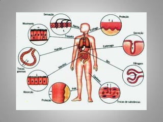 O documento discute aspectos da estrutura e função das células epiteliais. Aborda tópicos como membranas celulares, citoesqueleto, junções celulares, lâmina basal, especializações de superfície, classificação de epitelios e glândulas. Fornece exemplos de moléculas envolvidas em processos como adesão celular e comunicação. Explica a importância do estudo integrado dos epitelios considerando diferentes áreas como anatomia, bioquímica e fisiologia.
