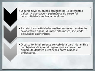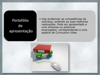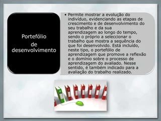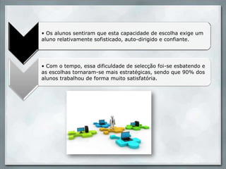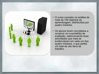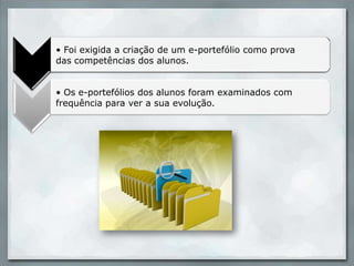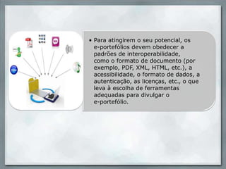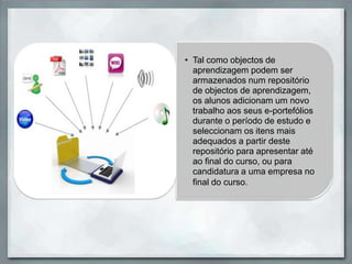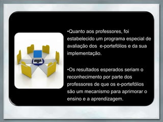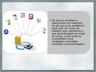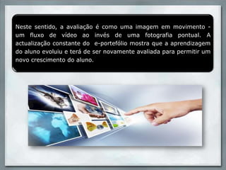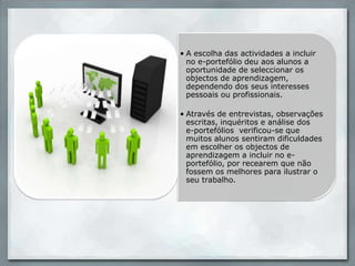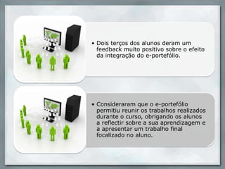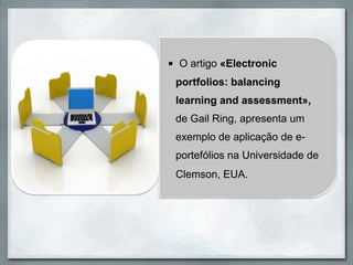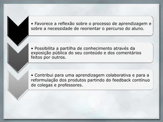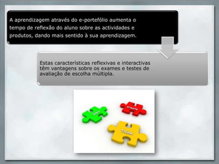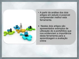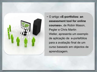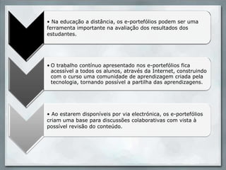 O documento discute as características e vantagens dos e-portefólios. Ele resume dois estudos que mostram que e-portefólios permitem adicionar variedade e aumentar o interesse do aluno ao permitir a inclusão de mídia como vídeo e som. E-portefólios também facilitam a avaliação do aprendizado e promovem a reflexão do aluno sobre seu próprio progresso.
