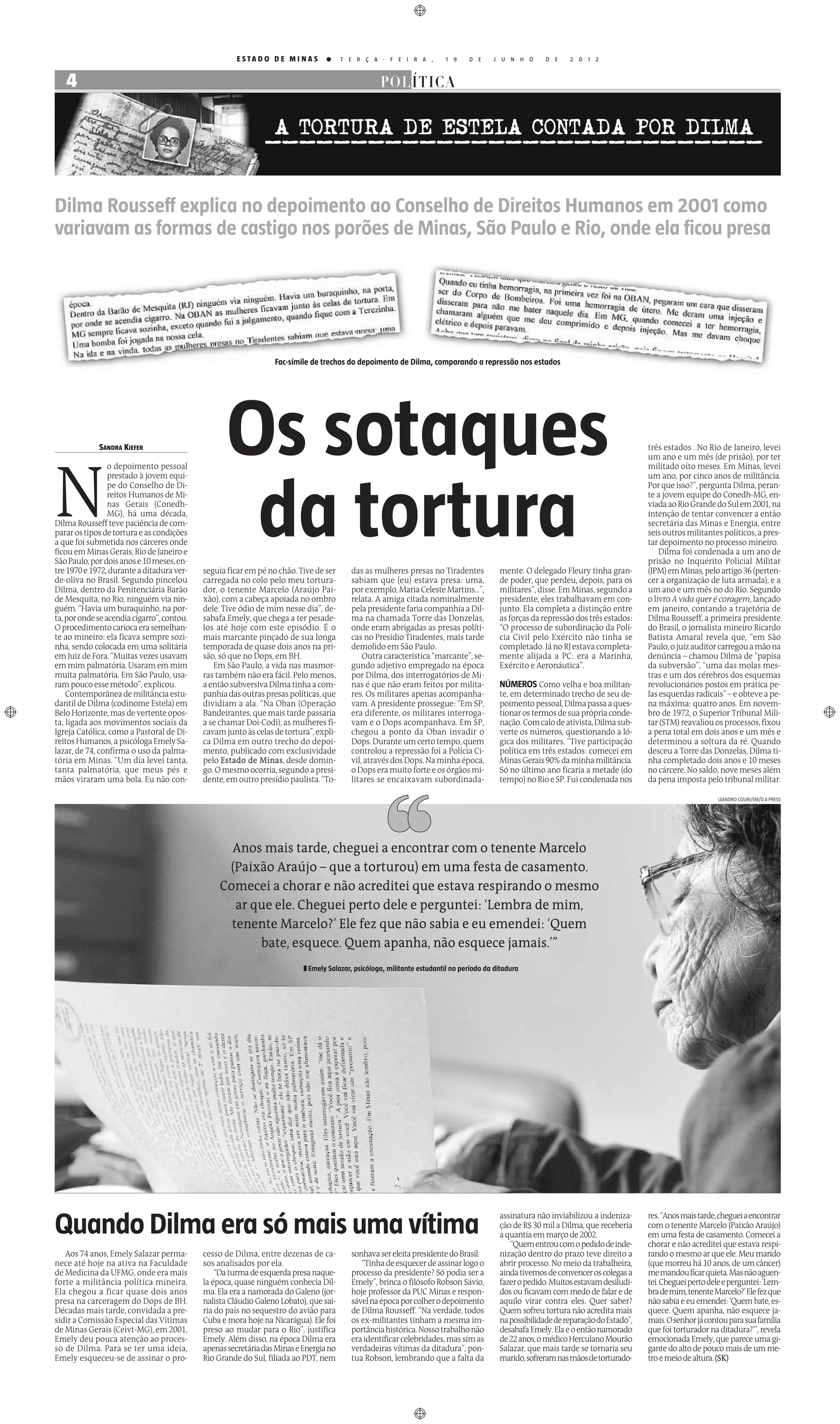 Dilma Rousseff deu um depoimento pessoal comparando as formas de tortura que sofreu em três estados brasileiros durante a ditadura militar. Ela descreveu em detalhes como a tortura variava entre Minas Gerais, Rio de Janeiro e São Paulo, incluindo diferentes métodos de castigo e isolamento. Anos depois, encontrou um de seus torturadores em Minas Gerais e o confrontou sobre os abusos que sofreu.