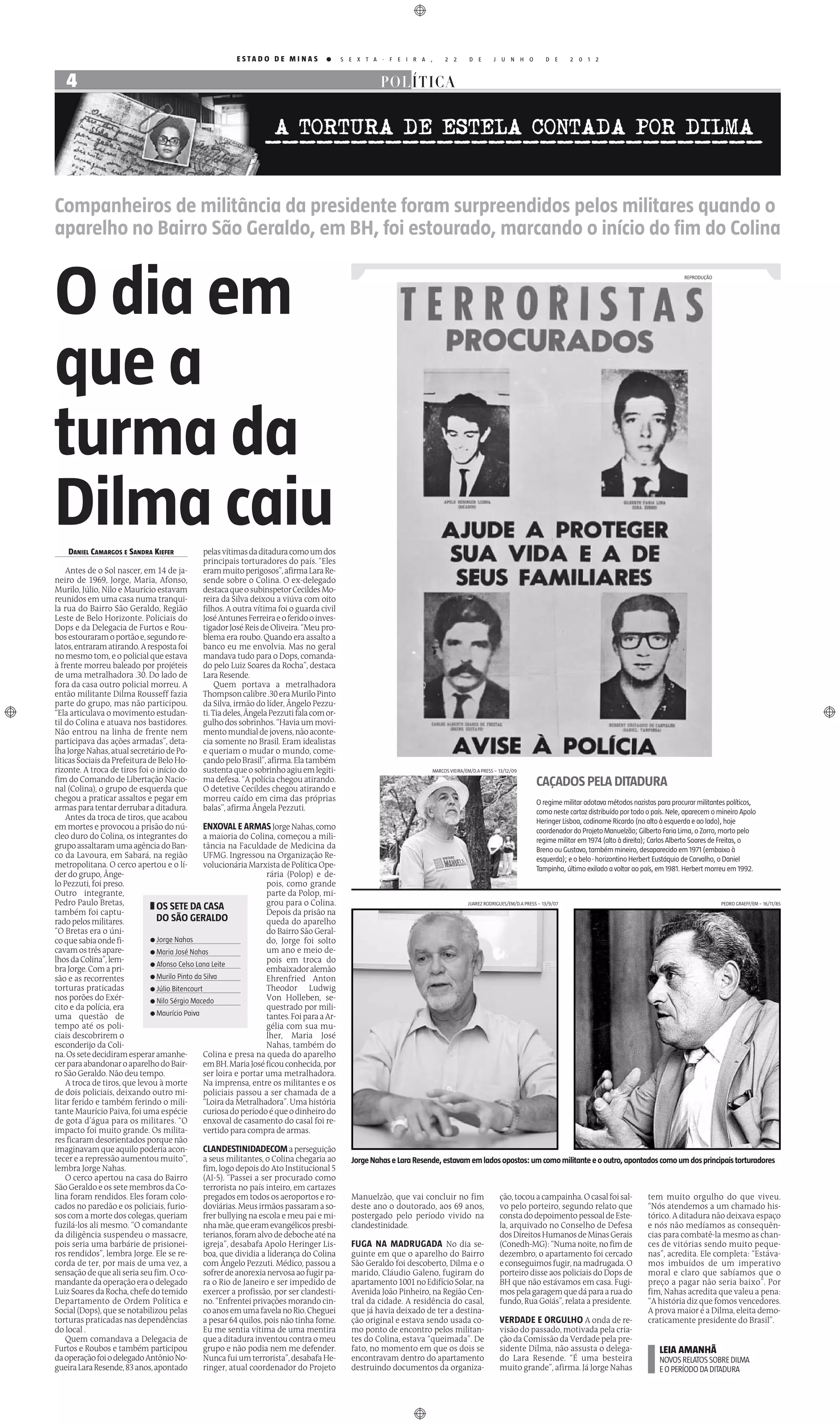 O documento descreve um tiroteio em 1969 entre membros do grupo de esquerda Colina e policiais em Belo Horizonte que marcou o fim do grupo. Sete membros do Colina, incluindo a futura presidente Dilma Rousseff, estavam reunidos em uma casa quando foram surpreendidos pela polícia, resultando em mortes de ambos os lados. Após o tiroteio, os membros remanescentes do Colina foram presos e torturados, enquanto a ditadura intensificava a repressão contra o grupo.