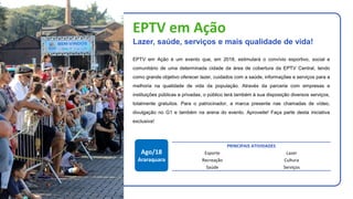 O documento descreve o evento "EPTV em Ação" que oferecerá lazer, cuidados com a saúde, informações e serviços para melhorar a qualidade de vida da população de uma cidade. O evento contará com parcerias para oferecer serviços gratuitos ao público e dará visibilidade às marcas dos patrocinadores nos canais e veículos de divulgação da EPTV.