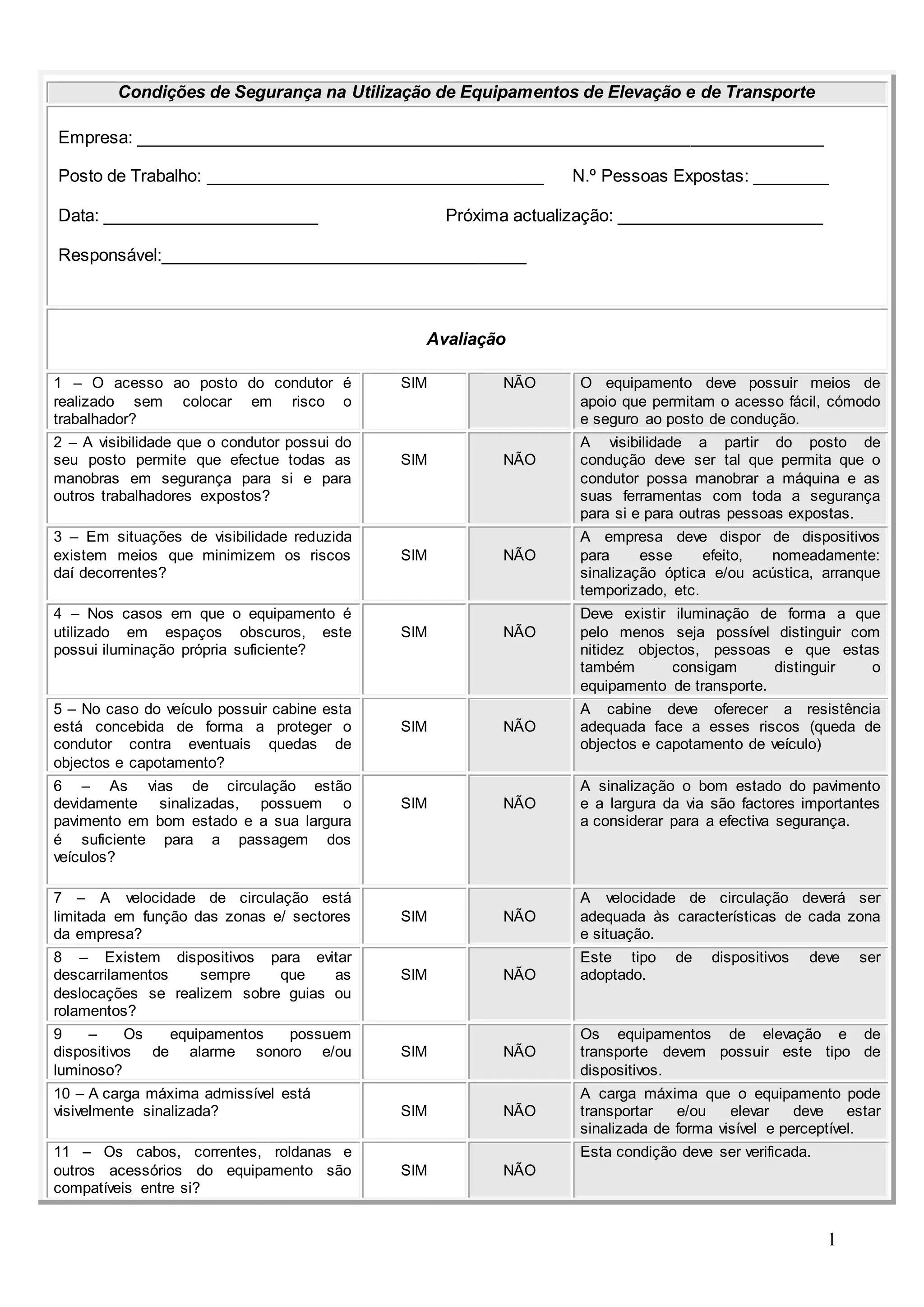Este documento fornece um checklist para avaliar as condições de segurança no uso de equipamentos de elevação e transporte em uma empresa. Ele avalia vários itens como acesso seguro, visibilidade adequada do condutor, sinalização de vias, limites de velocidade e carga, e programas de manutenção. As condições avaliadas podem ser classificadas como muito insuficientes, insuficientes ou a melhorar, com medidas propostas para corrigir quaisquer deficiências.