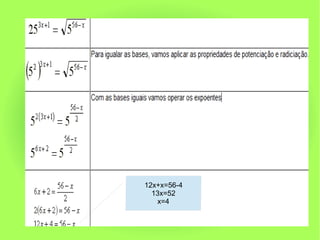 O documento explica que equações exponenciais são aquelas onde a incógnita está no expoente de uma potência. Para resolvê-las, devemos aplicar propriedades de potenciação como igualar bases para que os expoentes também sejam iguais. Exemplos mostram como resolver equações como 3x = 2187, 2x + 12 = 1024 e 2 4x + 1 * 8 –x + 3 = 16 –1.
