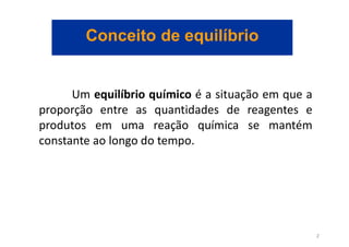 O documento discute conceitos de equilíbrio químico, incluindo: