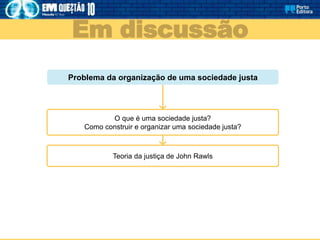 Este documento discute a teoria da justiça de John Rawls e como ele propõe que uma sociedade justa deve ser organizada. Rawls argumenta que os princípios da justiça devem ser escolhidos por indivíduos racionais e imparciais atrás de um "véu de ignorância", garantindo igualdade de oportunidades e maximizando os direitos dos menos favorecidos. Isso leva à escolha dos princípios da liberdade, igualdade de oportunidades e diferença. Críticas libertárias e comunitaristas também são disc
