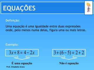 O documento define equações e seus componentes. Uma equação é uma igualdade entre duas expressões onde pelo menos uma contém letras. O primeiro membro está à esquerda do sinal de igualdade e o segundo membro à direita. Resolver uma equação é encontrar o valor que torna a igualdade verdadeira, chamado de raiz ou solução. Equações equivalentes têm as mesmas raízes. Exemplos e exercícios são fornecidos para testar a compreensão dos conceitos.